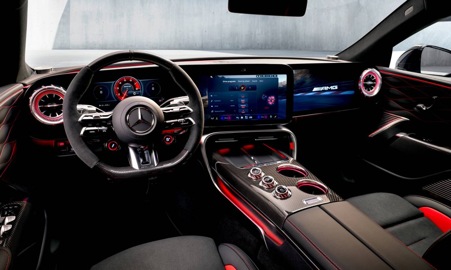 O visual escolhido pela Mercedes-AMG para a divulgação busca passar ares de esportividade, embora exista um evidente exagero. Praticamente toda a cabine é decorada em preto e vermelho. Os bancos trazem costura aparente e são estampados com o brasão da AMG. Esse mesmo símbolo também está estampado (e iluminado!) no teto de vidro.